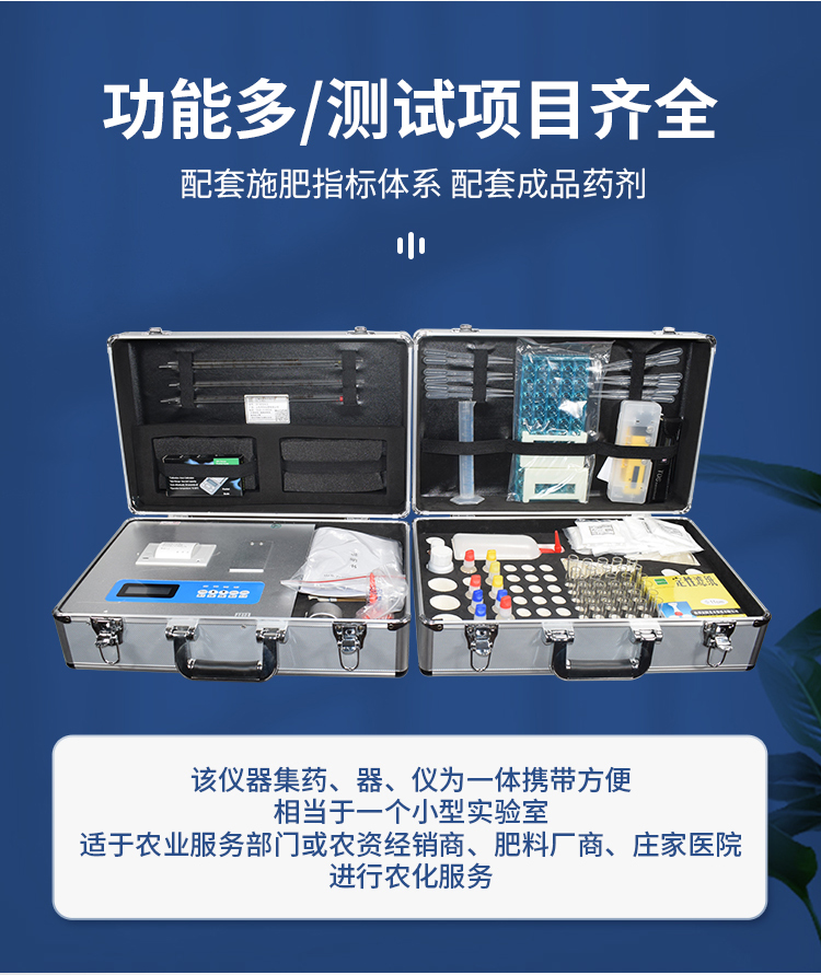 配套齐全:该仪器集药、器、仪为一体,携带方便,相当于一个小型实验室。适于农业服务部门或农资经销商、肥料厂商测土施肥和鉴别肥料真假。