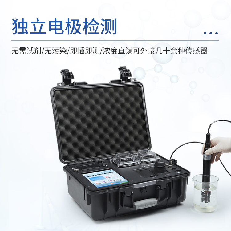 便携一体式多参数水质检测仪集成两种快速检测原理方法(分光法和电极法),采用高强度PVC工程塑料手提箱设计,消解检测一体式设计,其中消解模块具备双温区功能,检测部分同时具备360°旋转比色管检测和比色皿检测,安卓智能操作系统,8英寸高清液晶触摸屏,光纤检测技术,进口光源,内置大容量锂电池,便携多参数水质检测仪具有性能稳定、测量准确、测定范围广、功能强大、操作简单等特点。