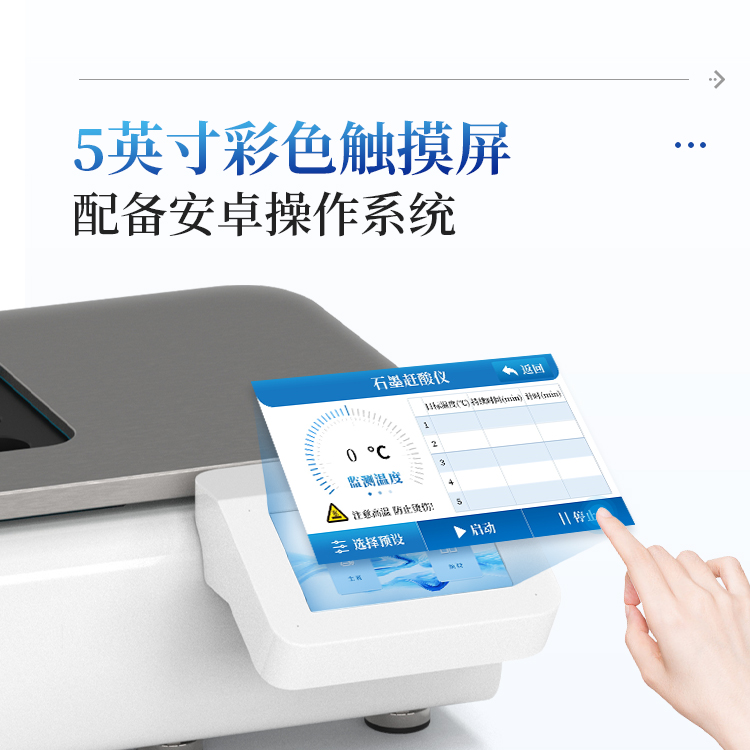简要描述: 石墨消解仪IN-GS10使用5寸彩色触摸屏进行仪器操作,配备安卓操作系统,方便快捷;采用PID 控温技术,控温精度高,升温速度快, 从室温到260℃仅需25分钟;分段控温设置,即可单段升温,也可多段升温,设置灵活,仪器将自动按顺序完成;更适于易产生泡沫的样品;采用优质石墨炉内芯,平均温差较小,样品效果一致性好,热传导效率更高。石墨块具有特氟龙涂层,耐腐蚀,延长使用寿命。